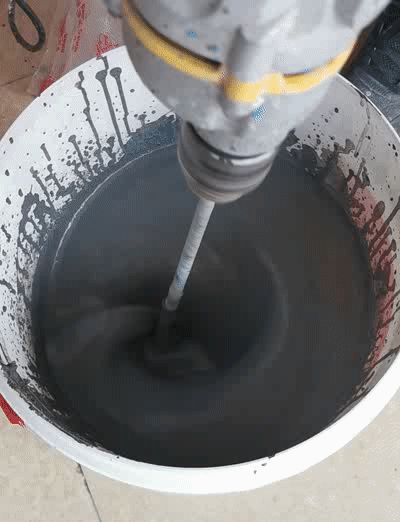 把一桶全新的德高K11柔性防水浆料开封,按比例倒入水桶中,同时用电动搅拌器搅拌3到5分钟,便形成了无沉淀、无粉团的浆料。搅拌过程中,小浪发现浆料十分顺滑,搅拌起来一点不费劲。