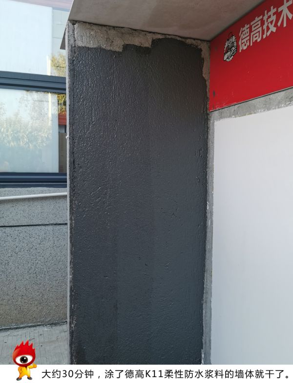 滚涂后大约30分钟,小浪用手触摸涂了浆料的墙体,发现墙上的德高K11柔性防水浆料已经干了,这对于要涂两三遍的防水工艺来说,可是大大节约了施工时间,省下不少人工费用。