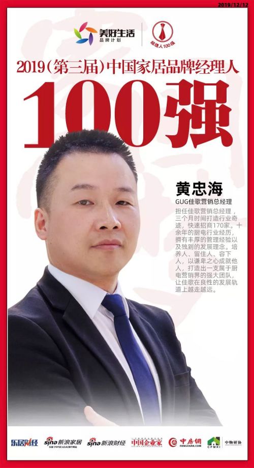 2019年12月12日,“致敬追梦人·致远中国梦——2019(第三届)中国地产新时代盛典暨2019中国家居新浪潮盛典”在北京举行。盛典现场,“2019(第三届)中国家居品牌经理人评选”结果揭晓。佳歌集成灶营销总经理黄忠海获“2019中国家居品牌经理人100强”。