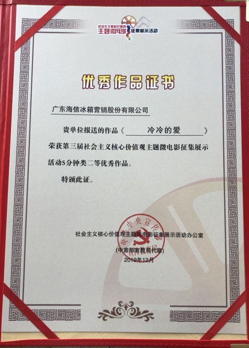 12月14日,由中xuan部宣教局、中央网信办网络新闻信息传播局、中央新闻纪录电影制片厂共同主办的第三届社会主义核心价值观主题微电影征集展示活动评审结果揭晓,其中,容声35周年特别企划广告片——《冷冷的爱》在3136部送选作品中脱颖而出,荣获5分钟类优秀作品二等奖。央视《新闻联播》《朝闻天下》接连报道,共同聚焦社会主义核心价值观的影视化传播。