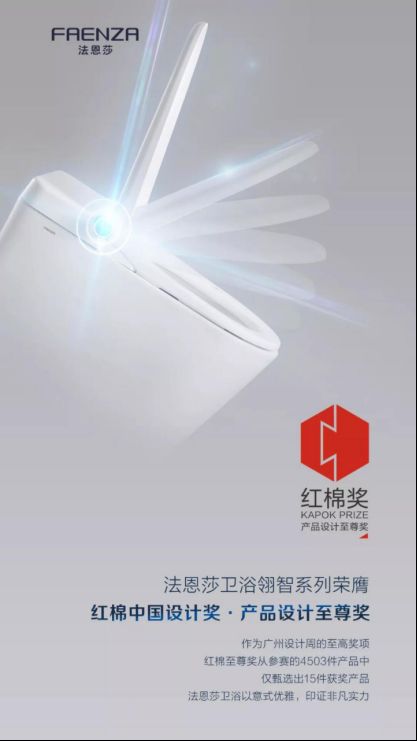 设计细节彰显人性化关怀,设计之美并不止于颜值,更在于其实用功能的出色。法恩莎“翎智系列”智能马桶凭借有「颜」有「料」的实力,独特的设计理念和创新的科技智慧,为人们带来了更健康舒适的如厕享受,更精致的生活体验,在众多参赛产品中脱颖而出,一举摘得「红棉中国设计奖-产品设计奖」及「红棉中国设计至尊奖」两大奖项!