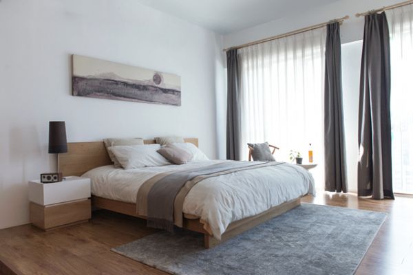 将屋主喜爱的灰蓝色运用在床头墙面,搭配自然温润的木质床架与床头柜, 以隽永雅洁的色调呼应两人世界的简单生活。因屋主衣物较少,更衣间以层板搭配吊衣杆砌筑开放式储物空间,方便置放原有的三层柜、行李箱等大物件,空间运用上更为灵活弹性。