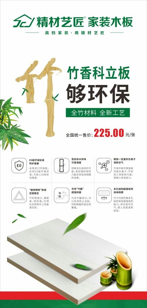 在结构方面;精材艺匠竹香科立板采用E0级环保饰面+竹木基材+封边条组合而成。精材艺匠竹香科立板表面采用E0级环保饰面纸,耐刮耐磨又抗污;同时用严密封边条实现防潮功能。竹木基材具有特殊的清香气味,可达到一定的除虫效果;精材艺匠竹香科立板防腐蚀能力强、抗冲击能力强、味道清香、不易藏污纳垢等优点。