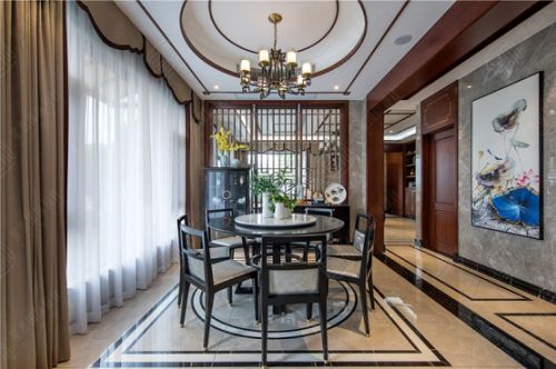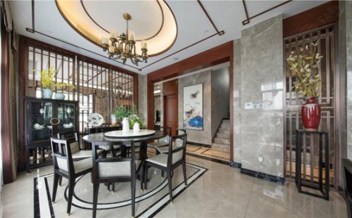 本次设计新中式别墅装修风格的中心思想,是以传统中式风格家具以明清木质家具为基调的,然后配以布艺和绸缎,在追求品味的同时,又不失高贵典雅。无锡星杰何国军老师在设计时颜色多以黑胡桃木为主,搭配中式吊灯、古香古色字画、各样瓷器古玩、方凳、窗棂、雕花隔断等,与玻璃、布艺、大理石、金属等现代元素相得益彰,典雅端庄,甚是雅致。
