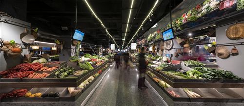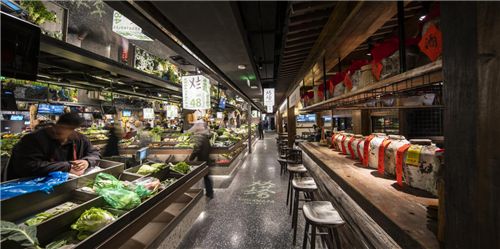 市集内的生鲜区域,从储物到陈列也全部进行了重新设计。原本平铺式的陈列方式,空间利用率较低。为此设计师采用立体及堆叠的陈列方式,增加视觉体验。小吃区临街也安装了一排可以转动的木排门,新鲜又带有怀旧色彩,增加空间的趣味性。
