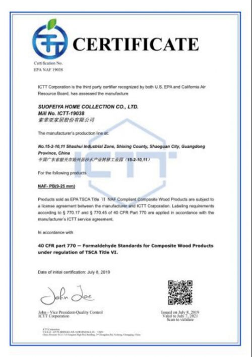 美国环境保护署颁发的EPA(NAF)无醛豁免认可