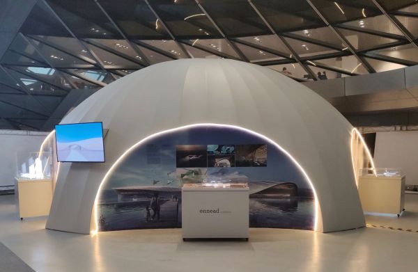 “科技苍穹”既是艺术展览装置,也是沉浸式体验空间。“科技苍穹”高4米,占地98平方米,灵感源于ennead主创设计的将于2021年开幕的另一重要作品——上海天文馆。“科技苍穹”延续了上海天文馆的空间形态,以星体与轨道为主要建筑元素,在不断辐射的椭圆曲线中建构了与自然世界交互融合的体验空间,外观形似天文仪器、内部由球幕影院与环绕阶梯式座椅组成。
