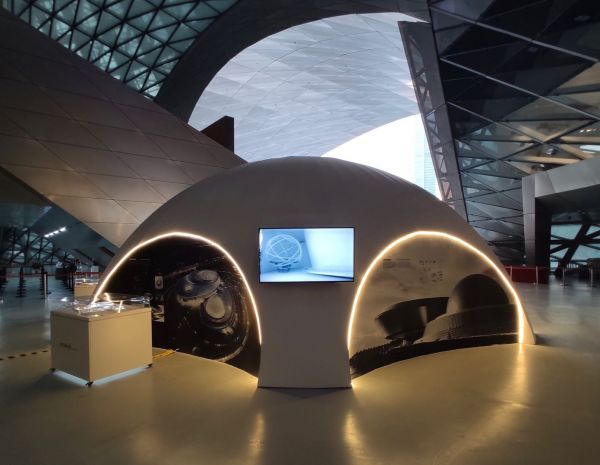 展览内部装置运用球幕投影成像与环绕音响技术,使体验者身临其境。有别于VR虚拟现实技术,球幕投影技术能最大化实现多人共同参与互动。该装置带领参观者感受自然世界的力量,希望人们能够重新思考人与自然环境和宇宙的关系。“科技苍穹”也将发挥公共空间的作用,号召人们聚集于此,探讨如何更好地关心城市与地球的未来。