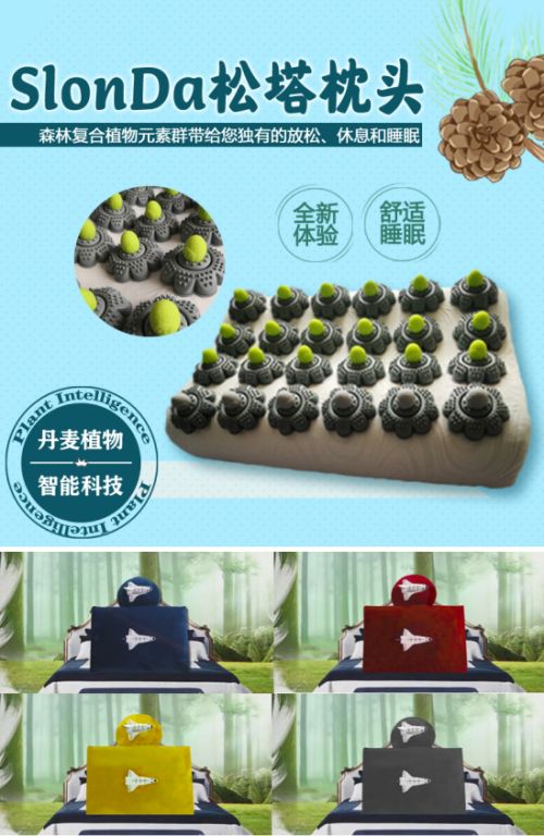 1965年 ,丹麦和瑞典科学家在探索全球各地的原始森林过程中,发现森林复合植物元素群,可令人身体健康、缓解疲劳、抵抗压力。经过反复研究终于提取和固化森林复合植物元素群、深海复合植物元素群。凭借于此,在1995年推出具有多层复合结构的基本自然成分和基本效能载体的SlonDa松塔枕头。SlonDa松塔枕头是一个全新的自然环境用品种类、自然睡眠用品种类、自然健康用品种类、自然缓解压力疲劳用品种类。