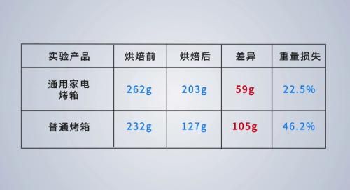 之后,工作人员将烤完后的鸡胸肉称重,结果显示,通用家电烤箱烘焙后的鸡胸肉重量为203g,重量减少59g,重量损失22.5%;普通烤箱烤制后的鸡胸肉重量为127g,重量减少了105g,重量损失46.2%,重量损失是通用家电烤箱的2倍之多。