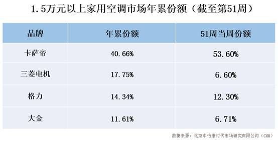 据中怡康最新销量数据显示,截止至第51周,在1.5万元以上家用空调市场中,卡萨帝、三菱电机和大金分列年累份额前三,份额分别为40.66%、17.75%和14.34%。而第51周当周份额出现大幅波动,卡萨帝为53.60%,三菱电机6.60%,格力12.30%。卡萨帝份额呈持续上涨趋势。