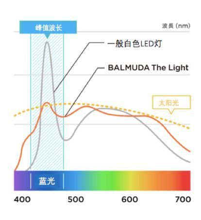 普通的LED台灯通过将黄色的荧光体放入蓝色的LED从而产生白色光芒,实现照明功能,随此日久,人们渐渐发现长久目视这种低成本光线会引起人体不适,其产生极强的有害蓝光可能会损害视网膜,因此近年来业内正在研究趋近于大自然中的太阳光光线,这一前沿发光技术也被应用于BALMUDA The Light太阳光LED台灯产品中。