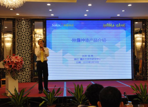 嘉乐士副总经理罗敏上台致辞,他表示,除霾神漆是嘉乐士在全国率先推出的一款能除雾霾的神漆。此产品凝结了集团100多位研究人员的智慧结晶,历经5年多的时间精心研制,并在全球范围内已获得相关技术及多项检测报告。