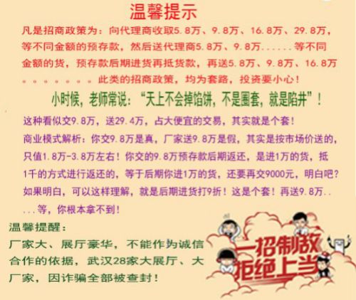 大厂家该被骗还是被骗。展厅和厂房看了之后,开始谈正事,他们经理开始给我洗脑,首先产品价格说是10-30都有。实际上他厂里根本没有便宜的板子。然后是大家都关注的问题是,让交6.8万,9.8万,16.8万等根据你做的区域等级门槛不一样,由于我是市区的,做的是经销商,投资的是9.8万,还送9.8万的材料,后期进货还有返点,每次进货返8个点,刚开始我想要更多的优惠,他们经理说和公司申请一下,最后给的是10个点的返利。殊不知9.8万并不是货款,这个经理给我玩合同文字游戏,详细的你听我给你说唉,他是让交9.8万的预存款,并不是货款。返点也不是额外的奖励。拿进货一万的材料来说,后期进货一万以返一千的形式返还,按照这个形式后期进货98万才能把前期投资的9.8万返还完,