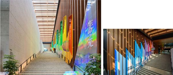 拾级而上,沐浴在流转的光中,人们既可以阅读大师们的智慧与思想,也能够透过色彩感受生命闪光时刻的灿烂。此外,大步梯墙面更贴心标注出展览用色色号,阅读者可以悉心收藏那抹触动内心的颜色,探寻自己“生命之光”的专属色彩。