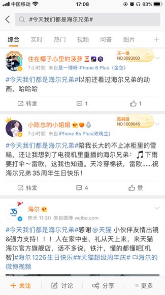 实际上,在不少中国消费者心目中,海尔已经成了一种成长的陪伴,融入到生活的点点滴滴。如今,海尔也迎来了自己的35岁生日。活动期间,在手机淘宝搜索“35岁的你”,就会发现一幅名为“海尔路1号”的长卷故事,展示了海尔35年来的创业“心路”。这个走心的彩蛋赢得了众多用户的点赞和祝愿。微博上,#今天我们都是海尔兄弟#话题登上热搜,阅读量突破1个亿。包括天猫在内的生态伙伴,通过官微与海尔互动庆祝。26日当晚,海尔联合天猫在青岛海滨点亮53栋楼体连屏,以一场超级灯光秀将周年庆活动引向高潮。