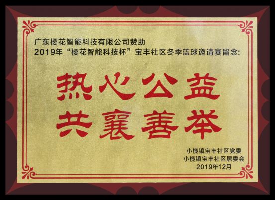 12月28日晚,由广东樱花智能科技有限公司赞助,小榄镇宝丰社区党委、宝丰社区居民委员会主办,小榄镇宝丰社区篮球协会协办的2019年“樱花智能科技杯”宝丰社区冬季篮球邀请赛正式开幕,在宝丰社区文化广场隆重举行。