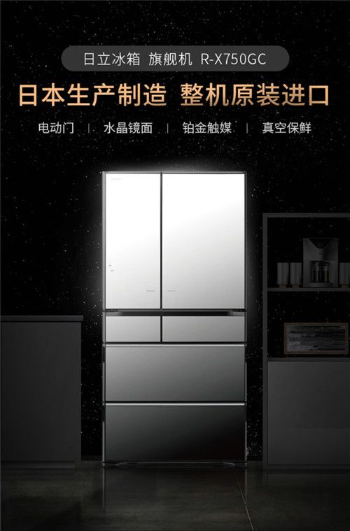 日立 R-X750GC拥有743L超大巨无霸容量轻松放进日常的食材,鸡蛋、牛奶、饮料、鱼肉、蔬菜、水果等统统都放得下。水晶玻璃面板采用一种类似镜面的工艺处理,纯净的平静的湖面,而且非常的抗造,不易刮损坏同时也是亮洁容易清洗。另外,日立 R-X750GC多门真空休眠保鲜冰箱采用触摸感应技术,手指轻轻一滑就可实现箱门自动单开/双开;轻触按钮,抽屉自动弹出,储存、取物更加轻松便捷。