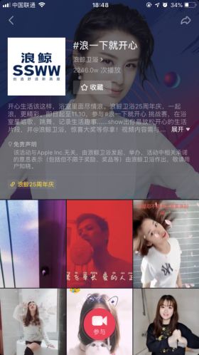 2019年11月,浪鲸发起#浪一下就开心#抖音挑战赛,联合多位抖音达人以多形式创作浴室短视频,演绎轻松愉悦的浴室生活,这一活动也吸引了千万级曝光量。