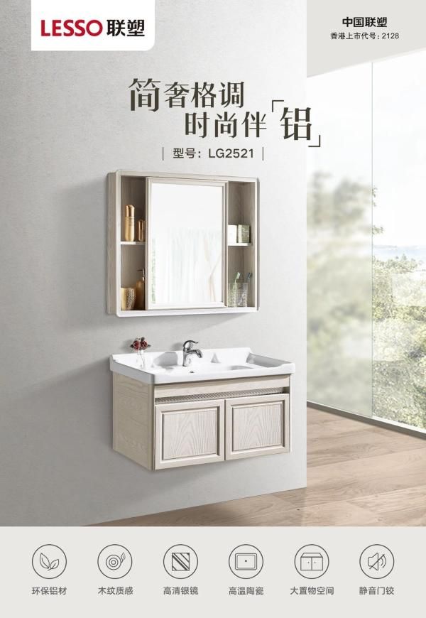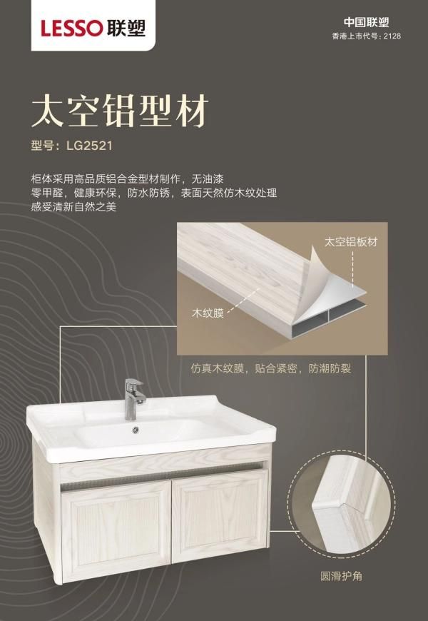 联塑太空铝浴室柜采用太空级铝合金型材,耐高温并能抗住强大冲击力,并且柜体表面经高温氧化处理后可防水、防腐、防锈、防霉、防裂,比普通浴室柜更坚固耐用,就算常年潮湿也不会发霉变形。