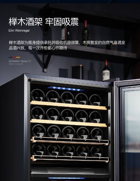 这款红酒柜采用的是榉木托架。榉木的酒架能为瓶身提供承托并吸收机器的微震,安全牢固。榉木材质牢固不易变形,能闻到木质的淡淡古朴幽香,且色调柔和温馨,与红酒柜硬朗的色调形成鲜明对比。