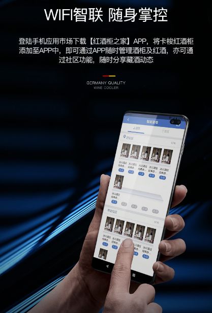 CASO卡梭还将现代科技融入到了红酒柜当中,使这款红酒柜紧跟时代潮流。它内置了wifi模块,用户只需要下载“红酒柜之家”APP,就可以随时随地掌握酒柜内的温度、湿度等运行状态。这款APP主要有四个功能:识别红酒的信息、分区温度控制、定位红酒的位置和标记开瓶的红酒。出门在外的你也能随时掌握到红酒的信息,十分智能化。