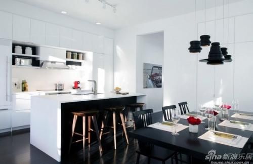 黑白色被奉为时尚界的经典色,在家居装修中,一般性格率真、喜欢简单的人群都喜欢运用黑白色来进行调配,以达到清凉通透的室内视觉效果。在本案中,黑白色的运用更是显得炉火纯青,开放的厨房空间和黑白着色的整体橱柜,让一切归至舒适与安逸的平衡点。