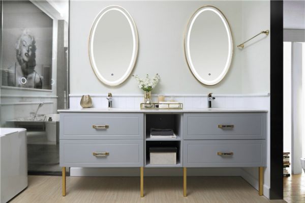 箭牌定制卫浴香榭低调而又奢华、精致优雅却不失浪漫的设计,彰显着轻奢的气派。金色的贝壳把手、铝合金材质的柜脚以及金属包边的LED灯镜,香榭定制卫浴以奢华的金色,让整个卫生间的视感醇透明亮而饱含优雅的力量。而双柜盆双椭圆LED灯镜的设计,不仅增大了收纳的空间,而且能最大限度利用LED灯的光源,来提升整个卫生间的亮度,从不经意间展现着灵动和柔美的气氛。
