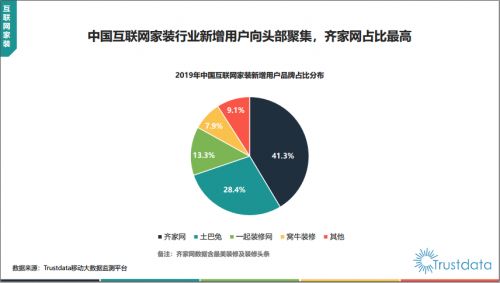报告指出,2019年互联网家装新增用户大量涌向齐家网,齐家网新增用户占行业新增用户的41.3%,远高于第二名土巴兔的28.4%。其实早在2018年,Trustdata 2018年度报告即指出,齐家网月活跃用户新增率高于行业整体,在维持生猛增长势头的情况下,齐家网今年占据行业新增用户半壁江山的结果并不意外。