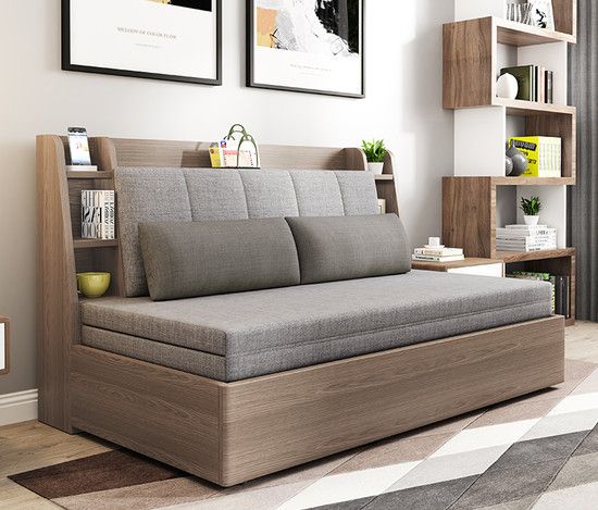 除了可伸缩的餐桌,可以折叠的沙发床对小户型也是相当友好的。有客人来,变身为床,没客人的时候就变身为沙发,随便放置在房间一角,既实用又起到装饰效果。下面的这款沙发床就非常值得推荐。它除了可以在床和沙发两个角色中随意切换外,还是一个收纳担当,它的靠背有隐藏的储物空间,床头也设置了置物层,不用担心书籍装饰摆件无家可归了。