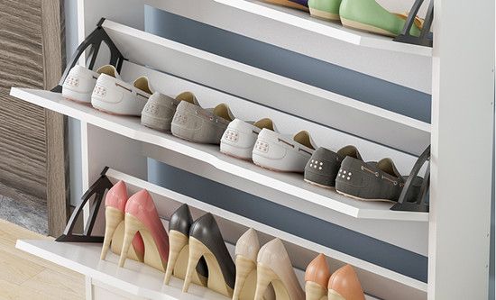 玄关是进家门第一眼就能看到的地方,对于小户型来说,如果玄关处的收纳空间太少,就会出现鞋子随地乱摆的“灾难”现场。所以一个超能装的鞋柜是很有必要的。这款鞋柜柜身仅有17厘米,结合翻斗设计,更省空间。它的顶层也贴心地增加了储物空间,可以放置出门时常用的钥匙、公交卡等物品,非常方便。