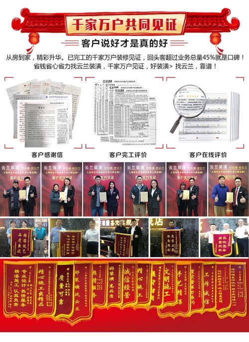 云兰装潢成立18年来,已为超万家上海市民提供了可靠,有保障的家装服务。 正是凭借着装修材料严格杜绝假冒伪劣,自建施工队伍工程不转包不发包质量、品质有保障和汪总直达号亲抓售后服务,很多客户在装修完第一套后得到心仪的装修效果和到位的售后服务,都会把自己的第二套,第三套房子放心地交给了云兰装潢来装修,这也造就了云兰装潢回头客占业务量的45%以上,成为行业内装饰装修回头客口碑品牌。