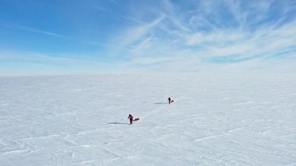 北京时间2019年12月22日凌晨4点30分,华耐登山队员(华耐登山队队长马建国、华耐登山队教练宋强)徒步到达南极极点