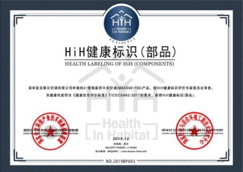 麦克维尔A+变频家用中央空调获“HIH健康”部品证书