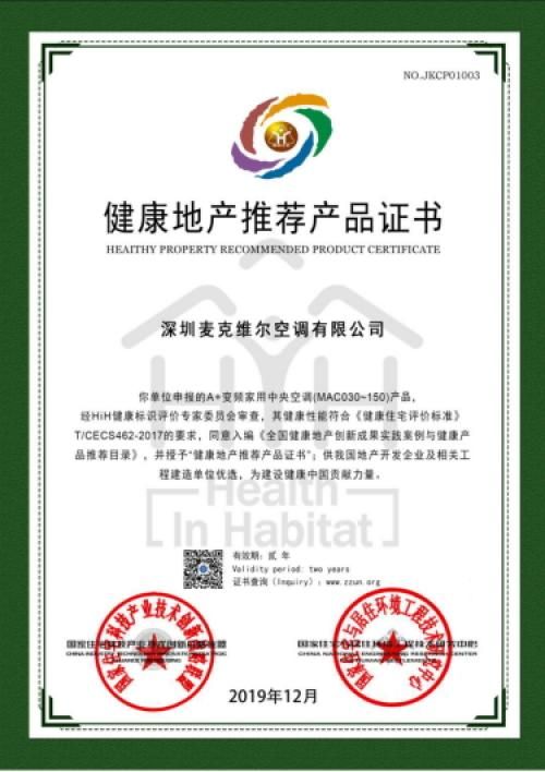 2019年12月,经HiH健康标识评价专家委员会审查,麦克维尔A+变频户式水机的健康性能符合《健康住宅评价标准》T/CECS462-2017的要求,同意入编《全国健康地产创新成果实践案例与健康产品推荐目录》,并授予“健康地产推荐产品证书”;供我国地产开发企业及相关工程建造单位优选,为建设健康中国贡献力量。
