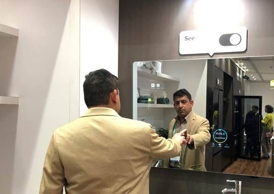 而挂在浴室墙上的智能卫浴镜也引众多参观者体验并拍照。这块镜子不仅能照,还能显示时间天气、进行音乐和视频新闻播报,充分体现了“显示无处不在”理念。其外接的皮肤检测仪可以显示皮肤含水量等信息,并从护肤品使用、睡眠和饮食三个方面进行健康养护。