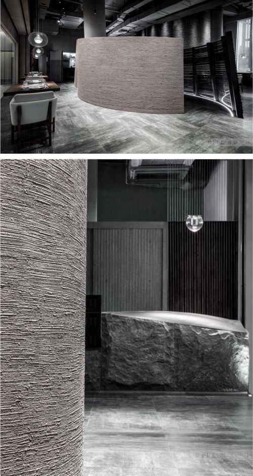 我们想要还原的空间氛围, 是温暖的,其次是时尚、艺术深度、空灵、错落和富有节奏感。在此基础上, 我们用了不同的材质 --- 一些更加粗犷的诸如水泥,石头墙面以及锈板和相对精致的定制特殊造型的不锈钢, 原始天花的保留,强调了高耸感,我们的空间感受不但是横向也是纵向维度。 大体块的艺术演变,比如最为核心的就是包厢的造型, 它是以泥土类材质作为外包裹, 巨大的弧形体块错落组合,希望人们在第一视觉感知中就留下陶乡具有的年代感和品牌深度。