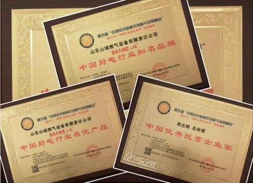 在颁奖盛典现场,山东山城燃气设备有限责任公司与海尔集团公司,松下电器(中国)有限公司,广州唯品会信息科技有限公司,完美(中国)有限公司,友智会营销策划(山东)有限公司,山东艾琳智能科技有限公司,山东天锦服装有限公司,山东学立方教育咨询有限公司,山东山城科技发展有限公司,青岛松上环境工程有限公司等行内优秀企业同台获奖,授予“山东山城燃气设备有限责任公司”荣获“中国厨电行业名优产品”“中国厨电行业知名品牌”称号;授予山东山城燃气设备有限责任公司总经理“周志鹏”荣获“中国优秀民营企业家”称号。