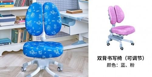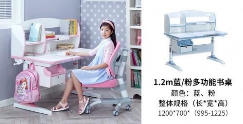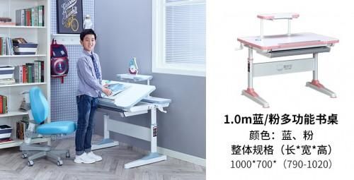 款式一书桌有蓝、粉两色,家长可根据孩子的性别、儿童房的风格进行书桌颜色的选择。同时,采用板材“微星面”表面设计,降低强反光刺激。多分区上架和尺槽抽屉设计,方便孩子储物。