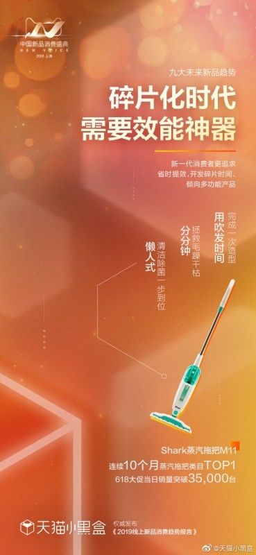 1月8日,天猫小黑盒对外发布了《2019线上新品消费趋势报告》,集中展现了新消费环境下,用户在衣食住行各个领域的需求趋势。其中一款满足了碎片化时代家务提效需求的清洁电器新品Shark鲨客蒸汽拖把颇为引人注目,以类目TOP1的优异成绩成为消费新趋势的代表产品。