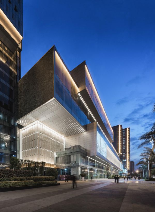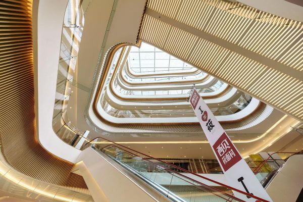 设计师柳景康从中国古代妆奁中汲取灵感,裙楼立面以多个错落退进的玻璃展柜,模拟珠宝盒拉开的滑动抽屉,打造出轮廓简洁具有东方韵美和商业活力的建筑轮廓,并以此寓意商业零售可以如同收纳琳琅珠宝的妆奁一样财源广聚。展柜内部为多种商业零售,部分展柜采用透明玻璃幕墙,使其成为绝佳的商业活动装饰展销或节假日庆典的展览平台,可以根据时节活动不断变化。