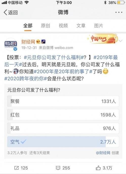 最近,微博上一个叫#元旦你公司发了什么福利#的话题吸引了3.2万网友参与,其中,竟然有2.7万网友都选择了公司福利是空气。我去,经济下行的大环境下,竟然有3/4的公司老板都选择了过节给员工发空气!