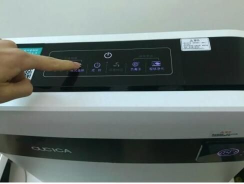 欧思嘉空气消毒净化器通过顶部黑色触控面板操作。开关键位于正中最显著的位置,下排从左到右依次为:童锁、模式选择、定时、风速档位、负离子和智钛净化键。