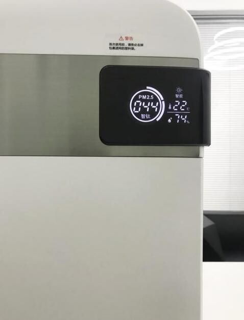 机身正面金属色面板实时显示空气质量,同步显示温度、湿度和PM2.5指数,实时监测空气净化程度。通过顶部的出风口排出洁净空气。机身侧面还有一个发光指示灯,内置传感器,灯的颜色会根据PM2.5值变化,室内空气最差时为红色,而最好时是绿色。
