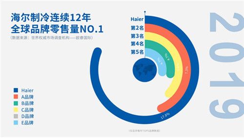 市场占有率最能反映消费者对海尔冰箱的评价。从全球市场看,1月9日,欧睿国际发布数据:海尔制冷全球品牌零售量连续12年蝉联全球第一。而且,自2008年至2019年,12年间海尔制冷首位度从1.65上涨至2.4,与其他品牌的差距持续拉大。而在国内市场,这种领先优势也在持续保持。据中怡康数据显示,2019年海尔冰箱年累份额37.3%,首位度为3.13,超过了二、三、四名之和。