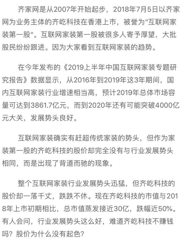 近期小编在梳理2019年上市科技公司和互联网公司的股价和财报时发现很多有意思的现象,接下来的时间睿财经将会连续介绍和分析这些有意思的股价。今天就从褒贬不一的"互联网家装第一股"—齐屹科技起。