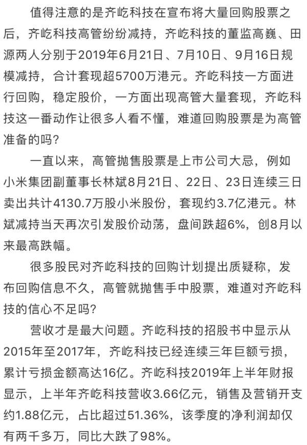 2019年齐屹科技为了拯救低迷的股价频频回购股票,齐屹科技在2019年6月17日发布公告称拟回购约最多1.21亿股股份,占不超过已发行股份总数的10%。据数据显示,从2019年6月19日开始到1月6日,齐屹科技已经进行超过70次的股票回购,多次回购对股市的拉动效果并不明显,股价依旧保持在3港元以下。