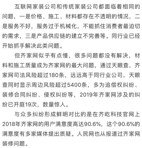 据315投诉平台统计,共收到齐家网消费投诉40多例,大部分都是因质量、施工等问题与售后沟通无果后才选择投诉。