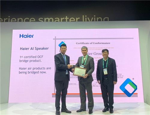 展会现场,在OCF执行董事John Park的见证下,国际权威认证实验室UL的副总裁Barry Yu为海尔AI智能音箱颁发认证证书。据了解,海尔AI智能音箱是全球首款搭载OCF-U+ Bridging国际标准的音箱,意味着在OCF认证下的产品可与此款音箱实现互联互通。