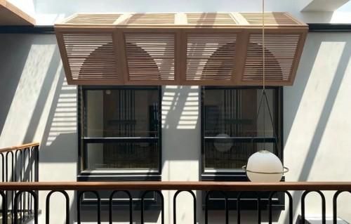 在「Central Street」中央大街漫步,顶部透明天窗与戏剧化对望的办公室玻璃橱窗形成一种外立面的连续感,木质条栏的加入则突出了天然肌理的温暖。阳光从上泻下,投射在隔层环抱的游览空间中,在灰白色的墙壁上勾勒出优美的几何线条,使整个空间沐浴在宁静的光明里。